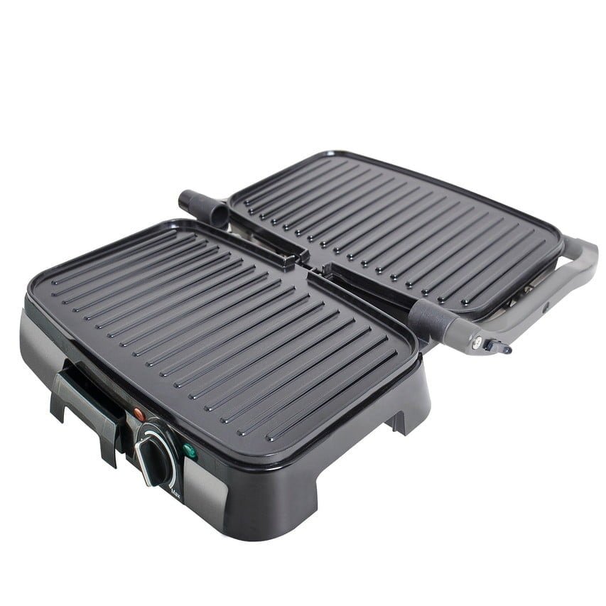 Versátil y potente para cocinar sándwiches, carnes o verduras. Con apertura 180°, superficie grill antiadherente y control manual de temperatura.