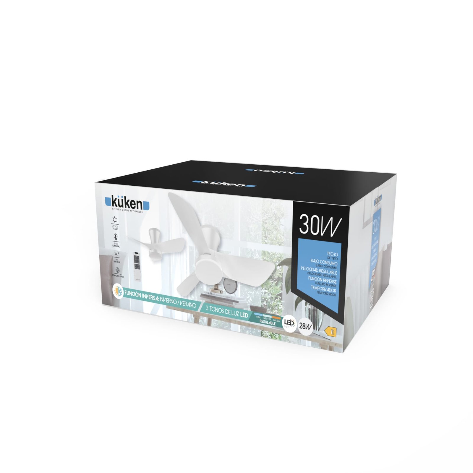 Ideal para espacios pequeños. Ventilador silencioso con luz LED, mando a distancia, función verano/invierno y temporizador. Diseño elegante y eficiente.